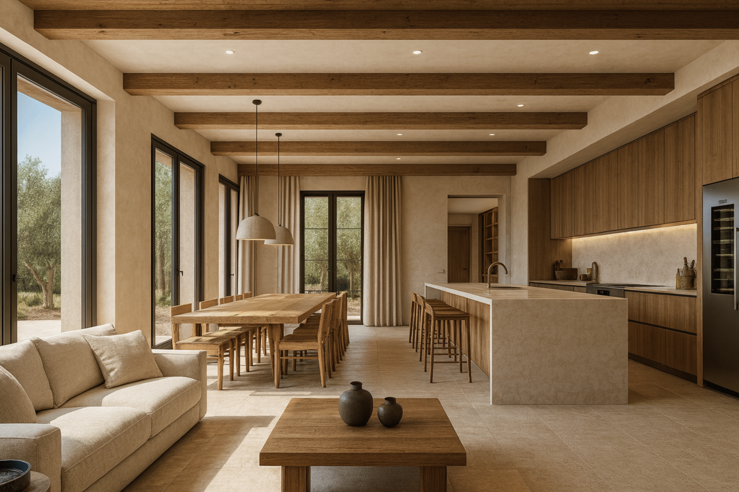 We are designing a very large family finca with approx. 400 square meters of living space – equipped with min. four bedrooms and four bathrooms, an open-plan living/dining and kitchen area with a kitchen island. Large window fronts connect the inside with the outside and let your gaze wander over the pool.
