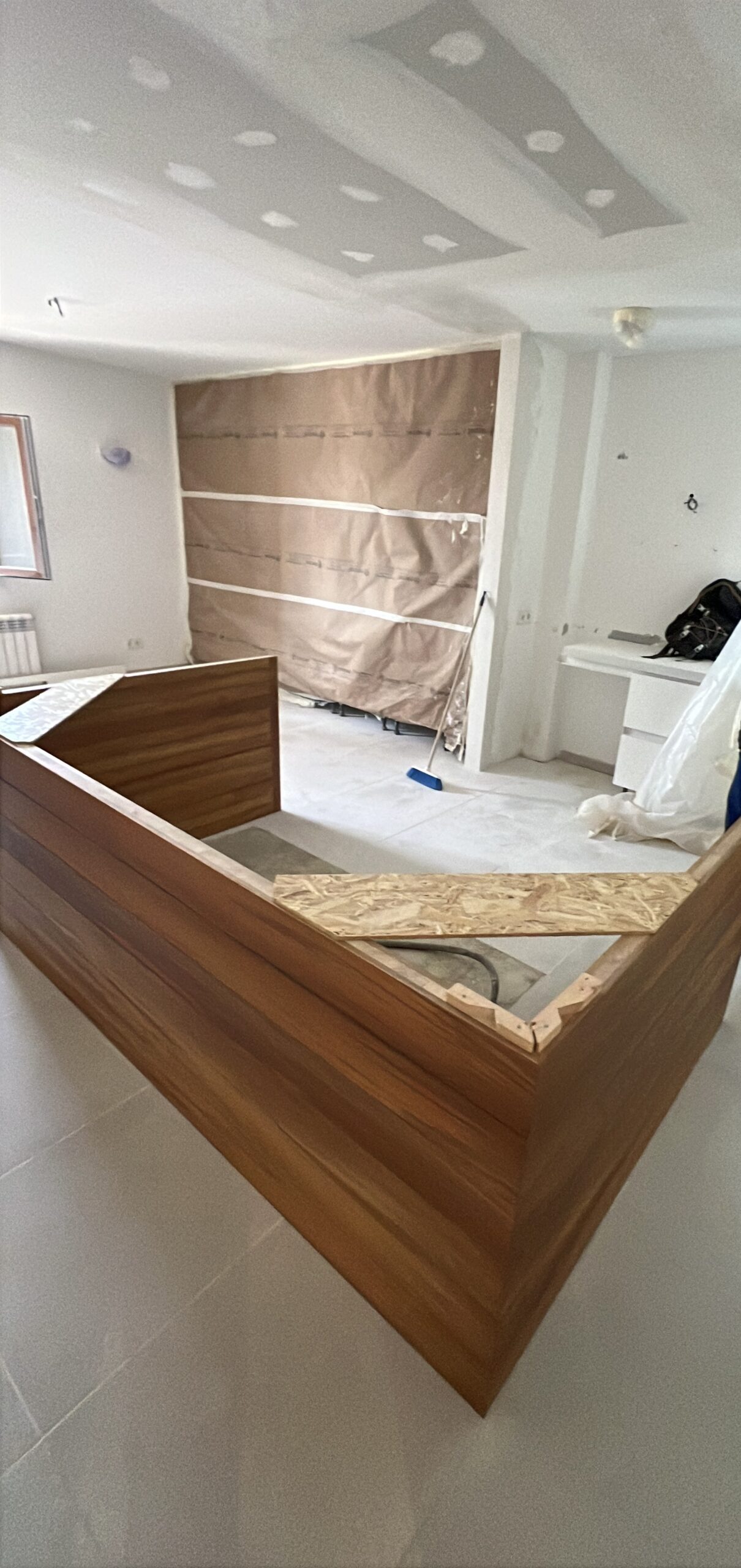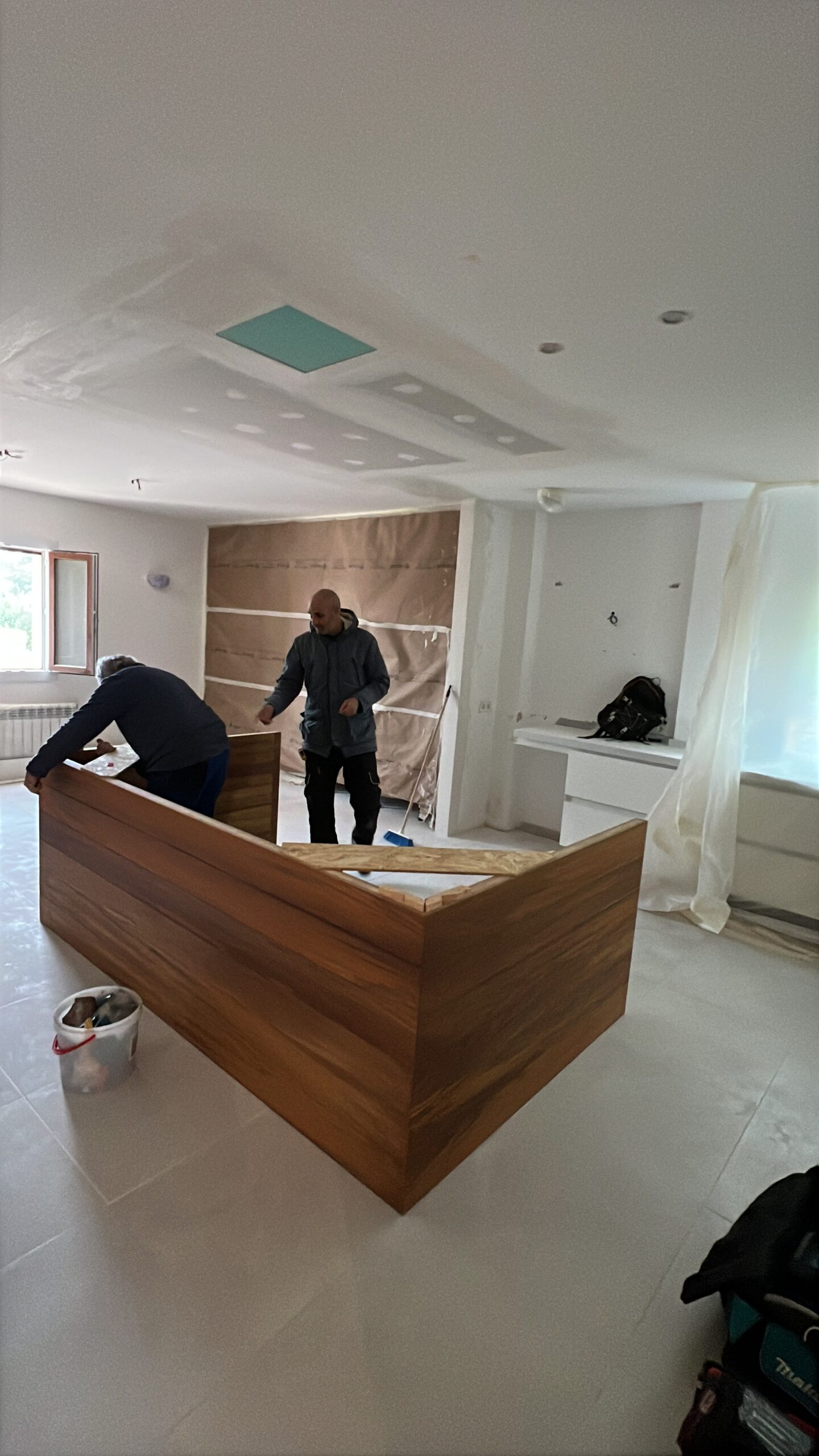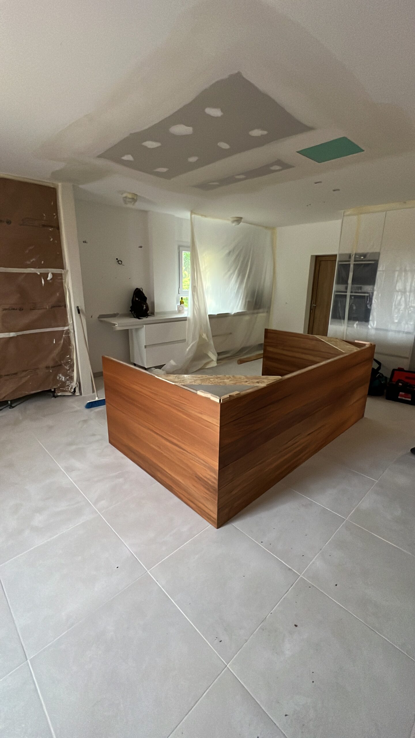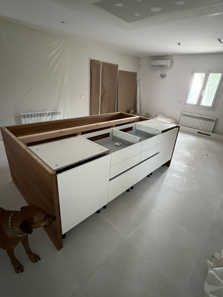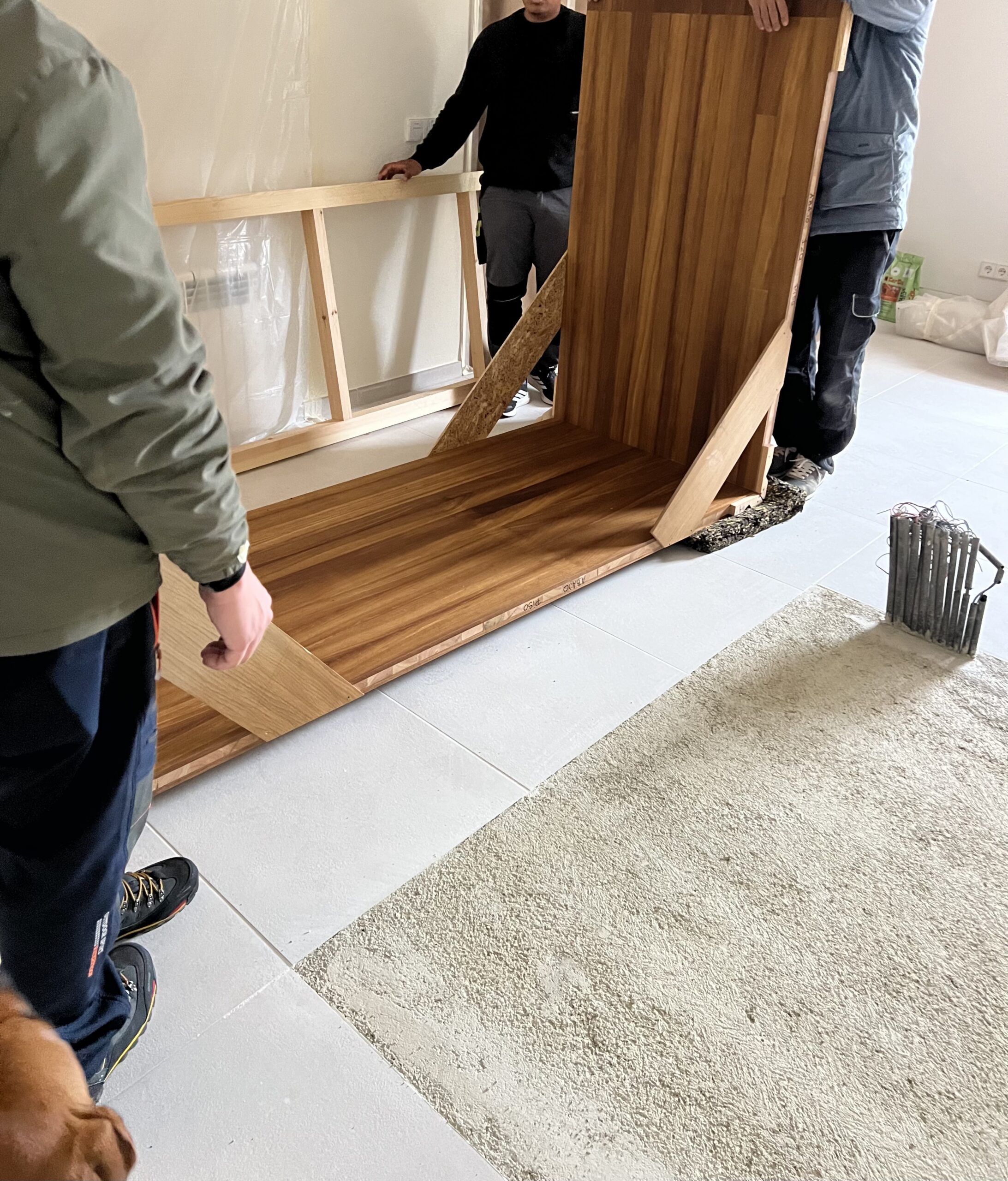 Herzstück der Neugestaltung ist die maßgefertigte Kücheninsel aus hochwertigem Teakholz. Das warme, natürliche Material verleiht dem Raum Charakter und schafft eine angenehme, wohnliche Atmosphäre. Tageslicht kann nun ungehindert einfallen und bringt die lebendige Struktur des Holzes sowie die gesamte Raumwirkung optimal zur Geltung.